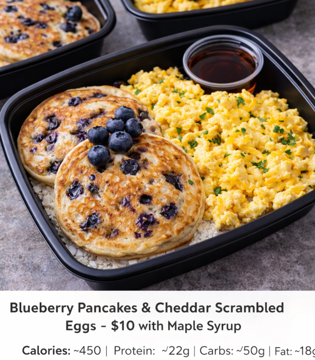 3 Fluffy blueberry pancakes paired with protein-rich cheddar scrambled eggs and a drizzle of maple syrup. A balanced breakfast with carbs, protein, and a touch of sweetness—perfect for meal prep or a hearty morning meal.